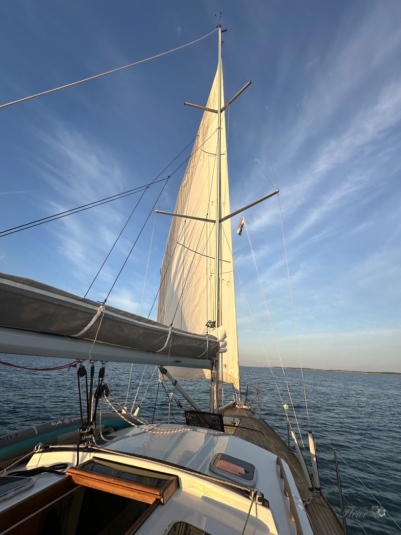 It is an all day wind parallel to the Istrien coast estimated. Not perfect with the wind straight from the back. Typically that is a slow course, waves pushing and the boat rolling. Not comfortable, but good to give us a push all the way.