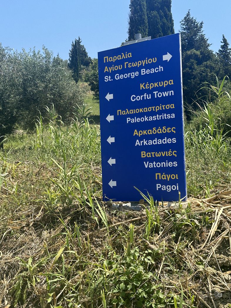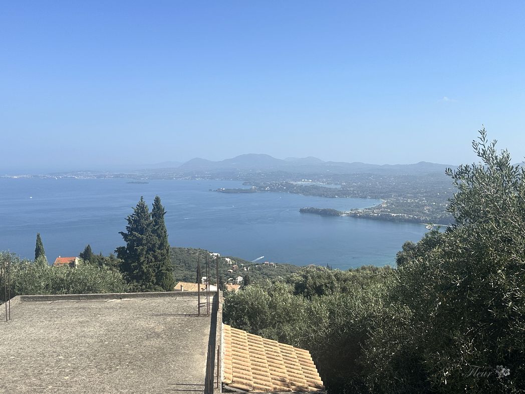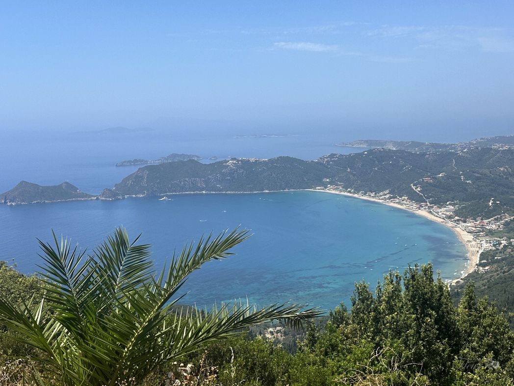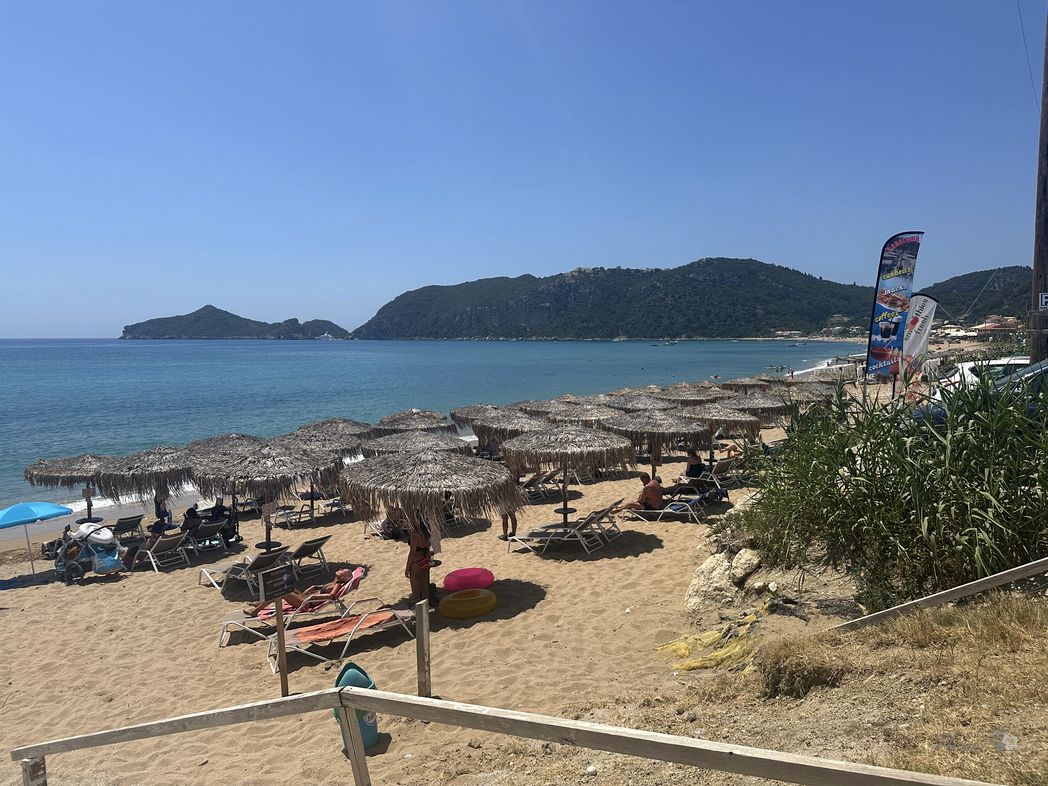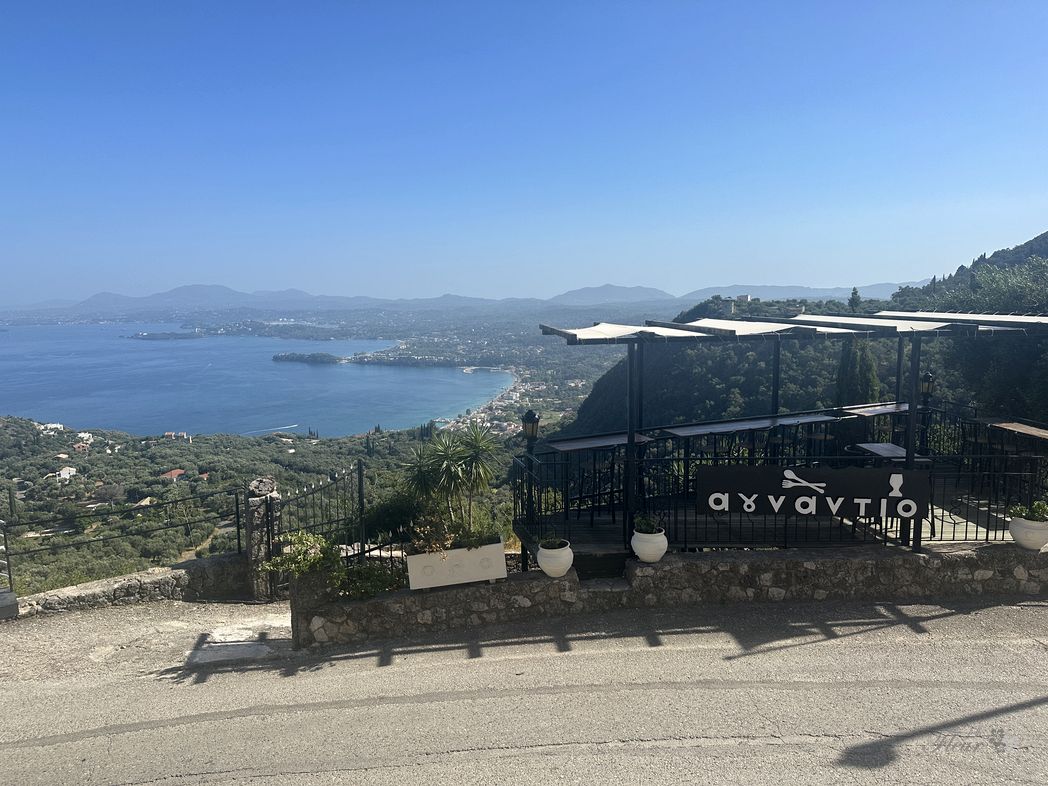 Over the ridge and circling down the winding road towards the beaches. A stop for a snach at a exposed restaurant (ΕΣΤΙΑΤΟΡΙΟ ΑΓΝΑΝΤΙΟ), providing a nice view to the far away marina and Corfu city.