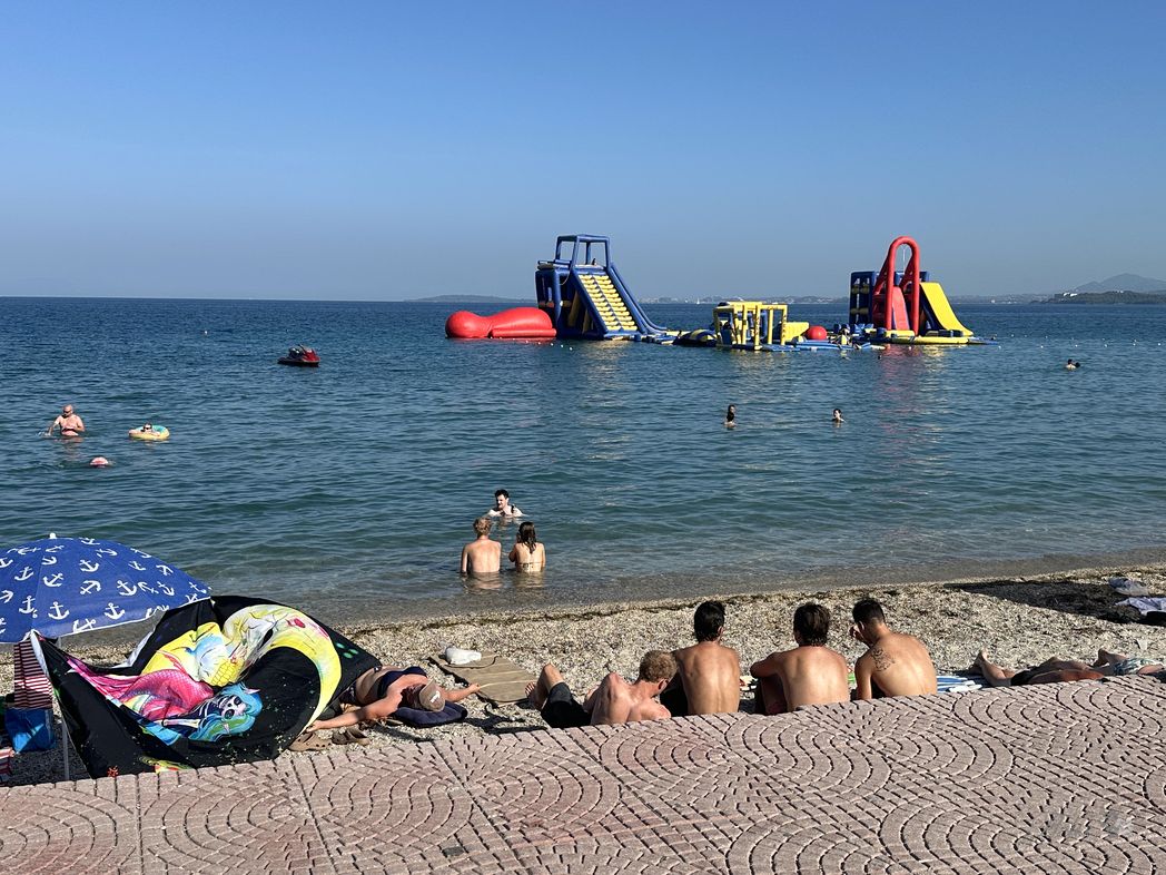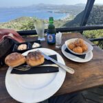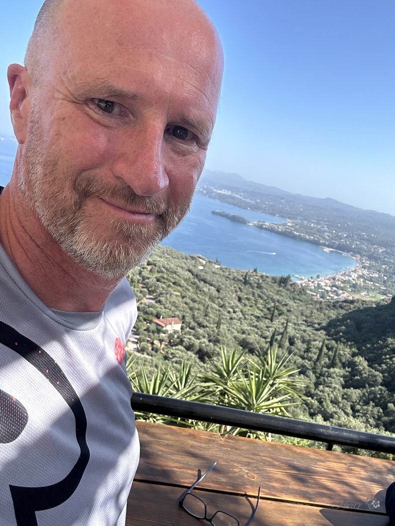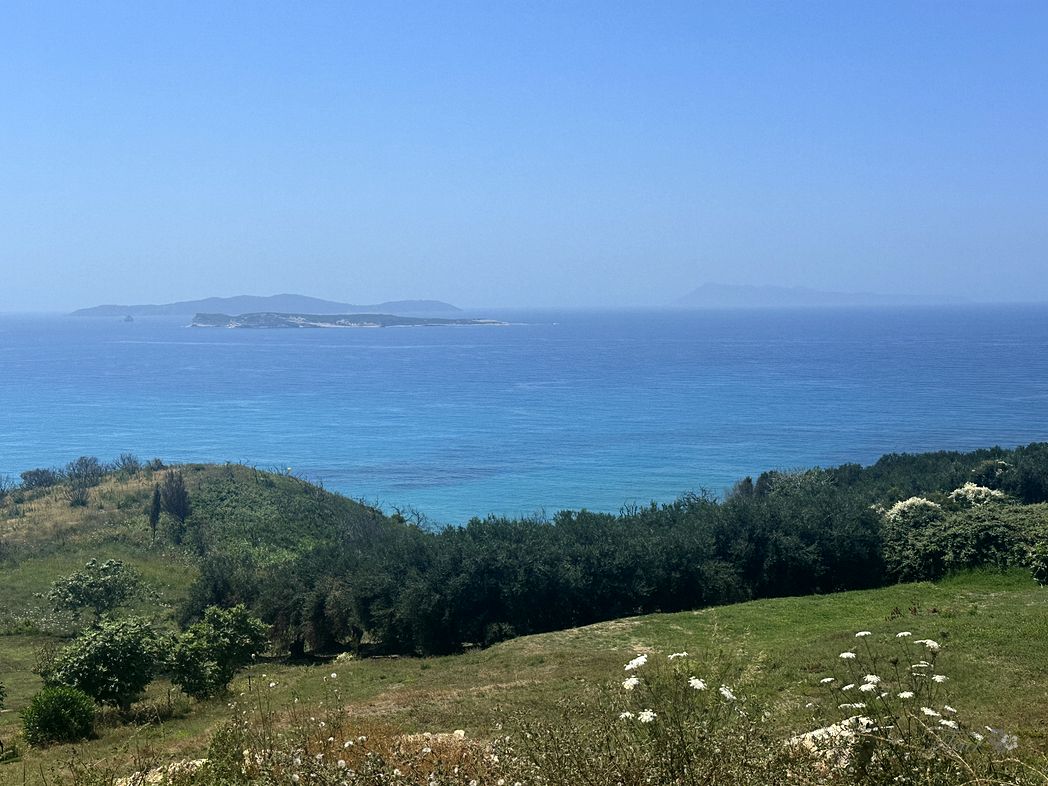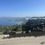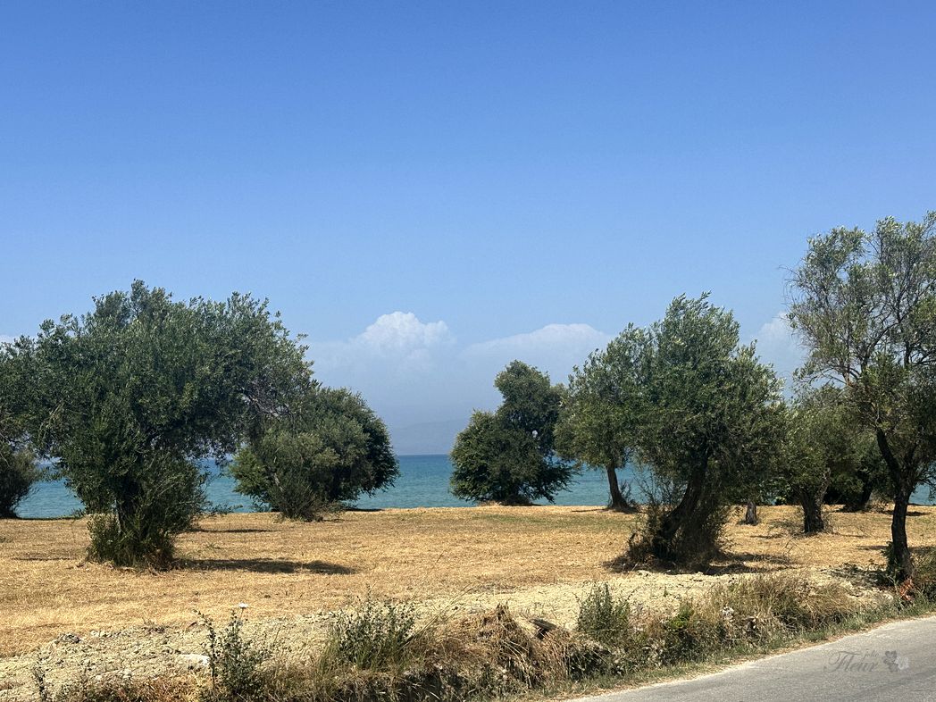 Over the ridge and circling down the winding road towards the beaches. A stop for a snach at a exposed restaurant (ΕΣΤΙΑΤΟΡΙΟ ΑΓΝΑΝΤΙΟ), providing a nice view to the far away marina and Corfu city.