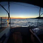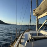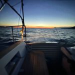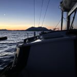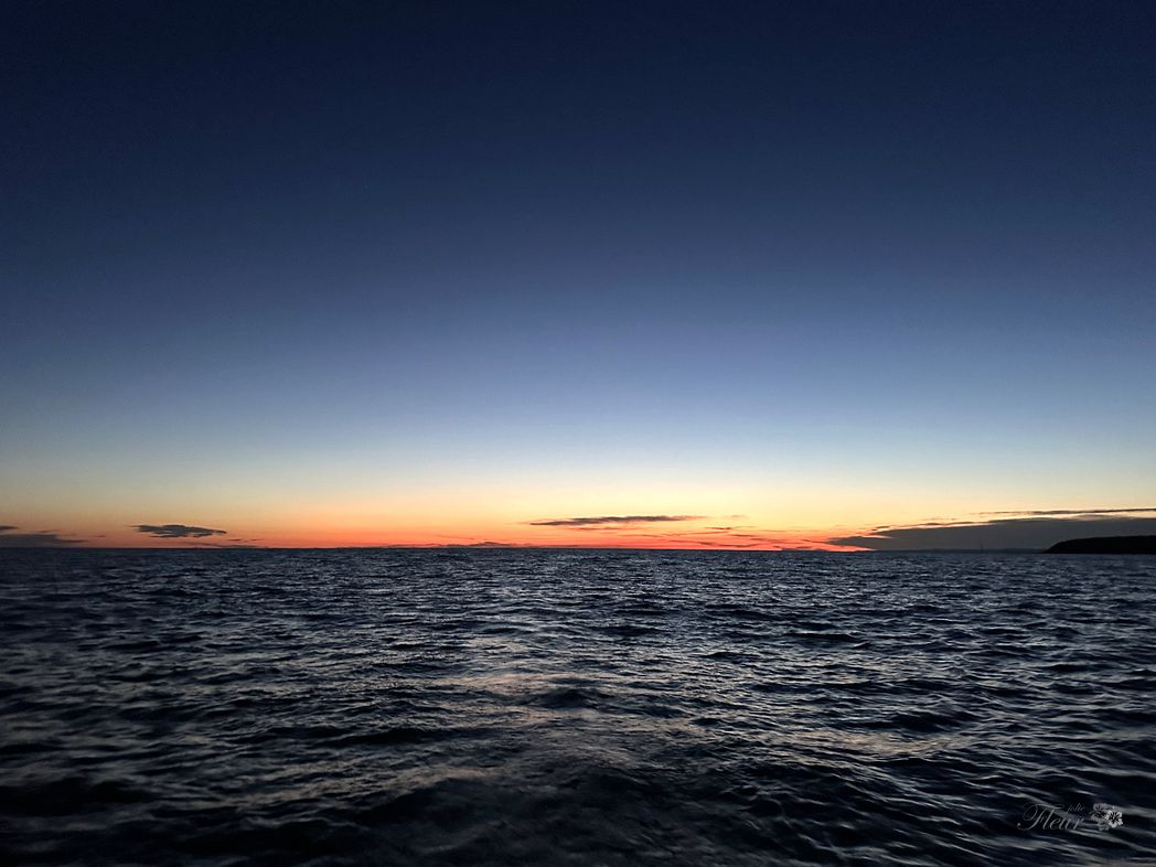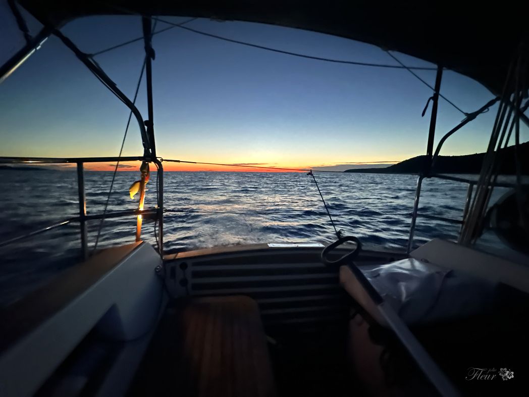 At the open water, sails up and bow pointing south. Nice. Passing the channel between Brac and Sesula. Further over to Hvar. Sunset is at 20:30, so I pass Hvar at already dark.